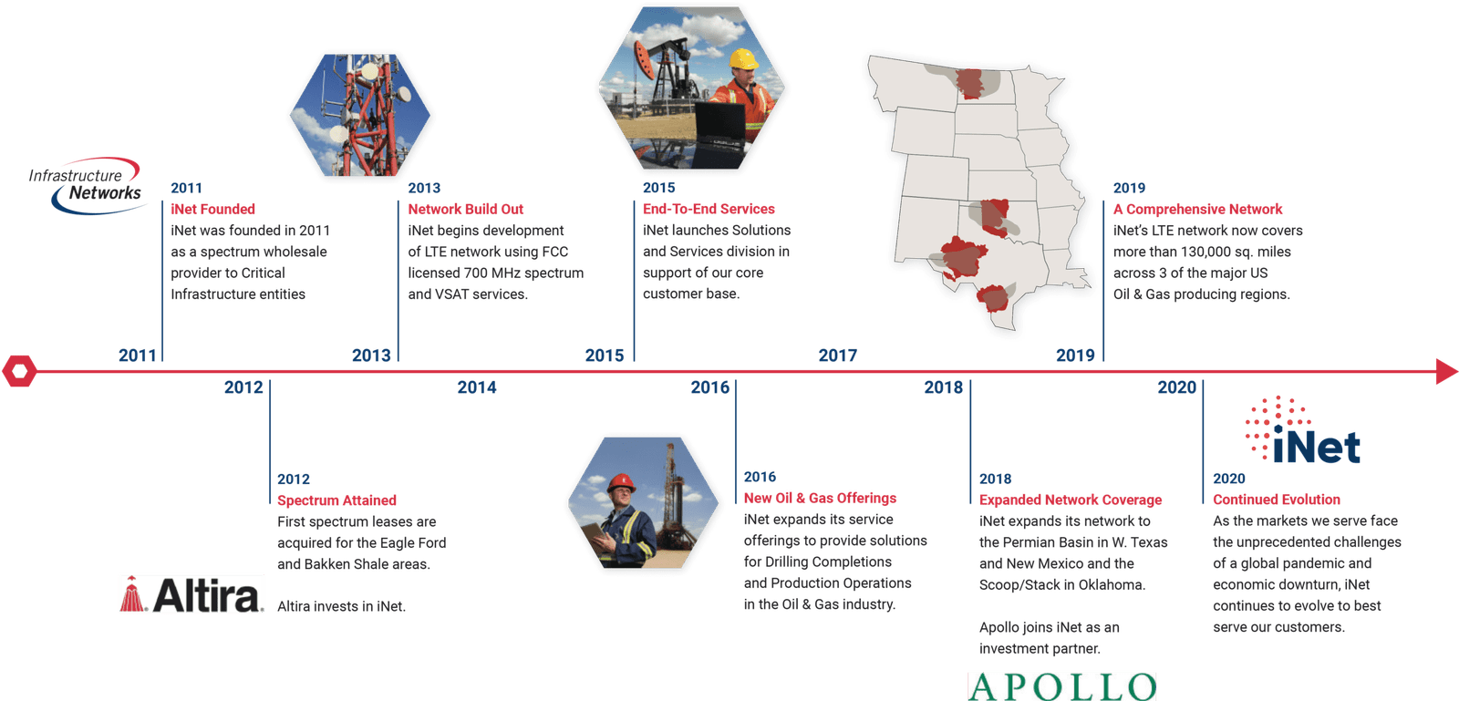 Infrastructure Networks (iNet) was founded in 2011 with a mission to bring broadband wireless connectivity to upstream oil and gas operators in remote, rugged environments. Over the years we’ve expanded our network coverage to over 130,000+ miles in the Permian, Bakken, Eagle Ford, and Scoop/Stack shale basins. Now, we’re delivering services across a variety of remote industries. And no matter what your business, our objective remains the same. We’re focused on delivering a level of reliability, availability, and throughput previously available only in corporate data centers and large downstream, highly automated facilities.