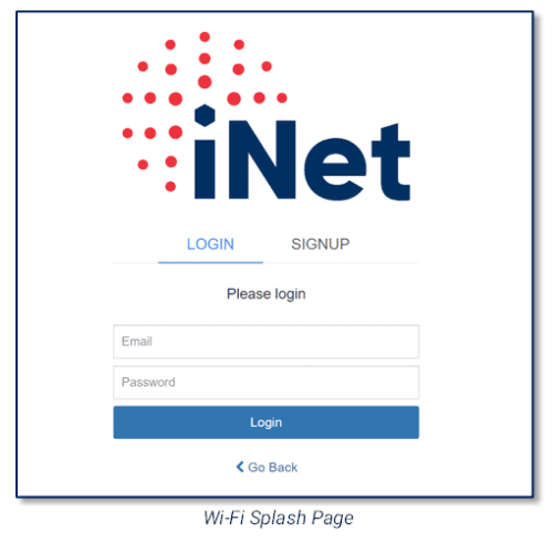 From this splash page the user will Sign Up, or if they are an existing or previous user, Log-In with an email and password. Once they have logged in, the will have access to the internet service. No IT administration or network engineering is required for this process. The user will have their daily service allotment or service rate then be able to use the internet as normal.